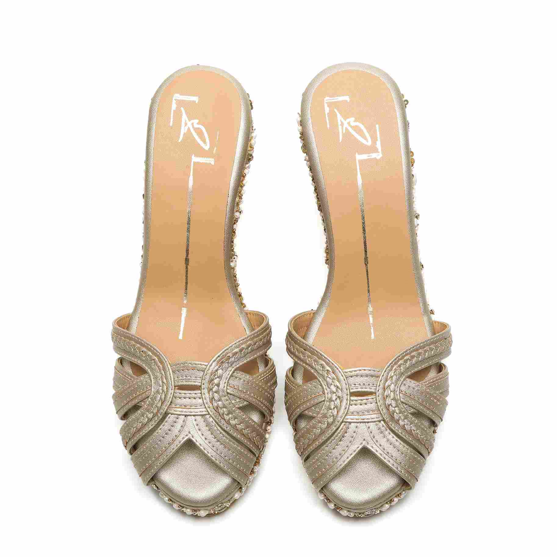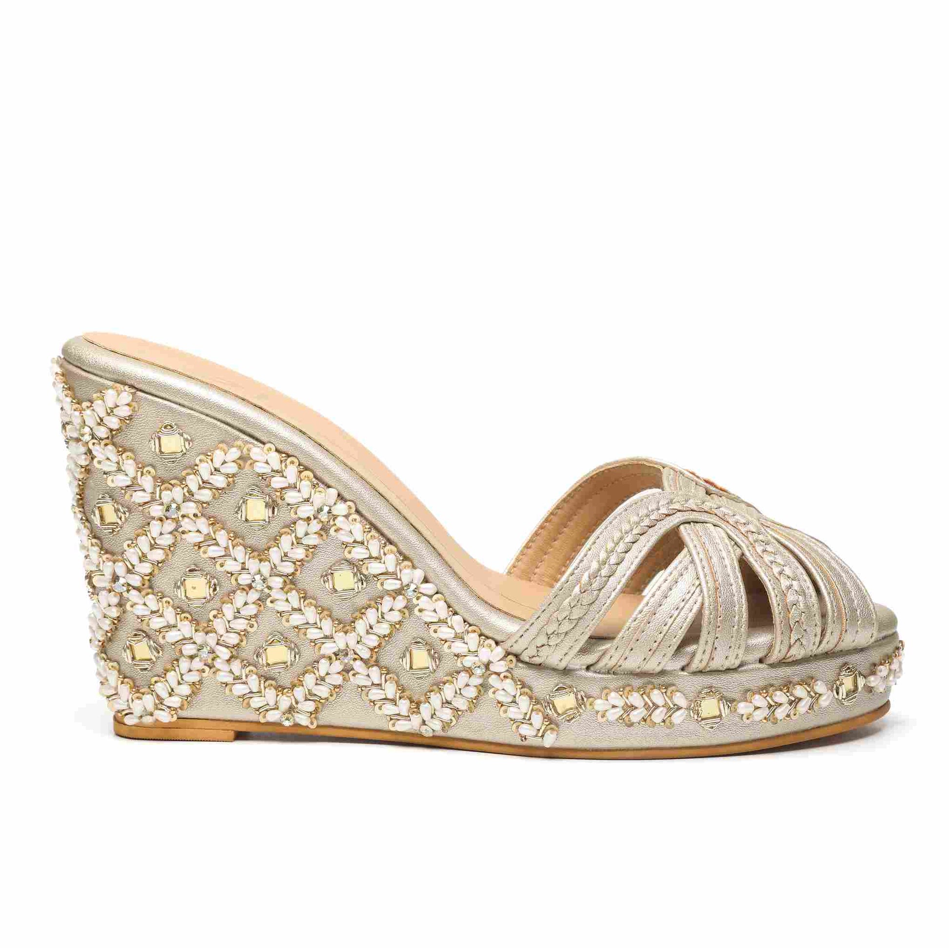 Featuring a gold strappy wedges in faux leather base with embroidery. It has a faux leather underlining, gel cushioning and 4 inch heels.