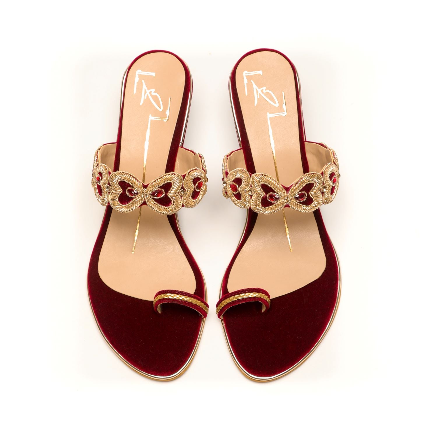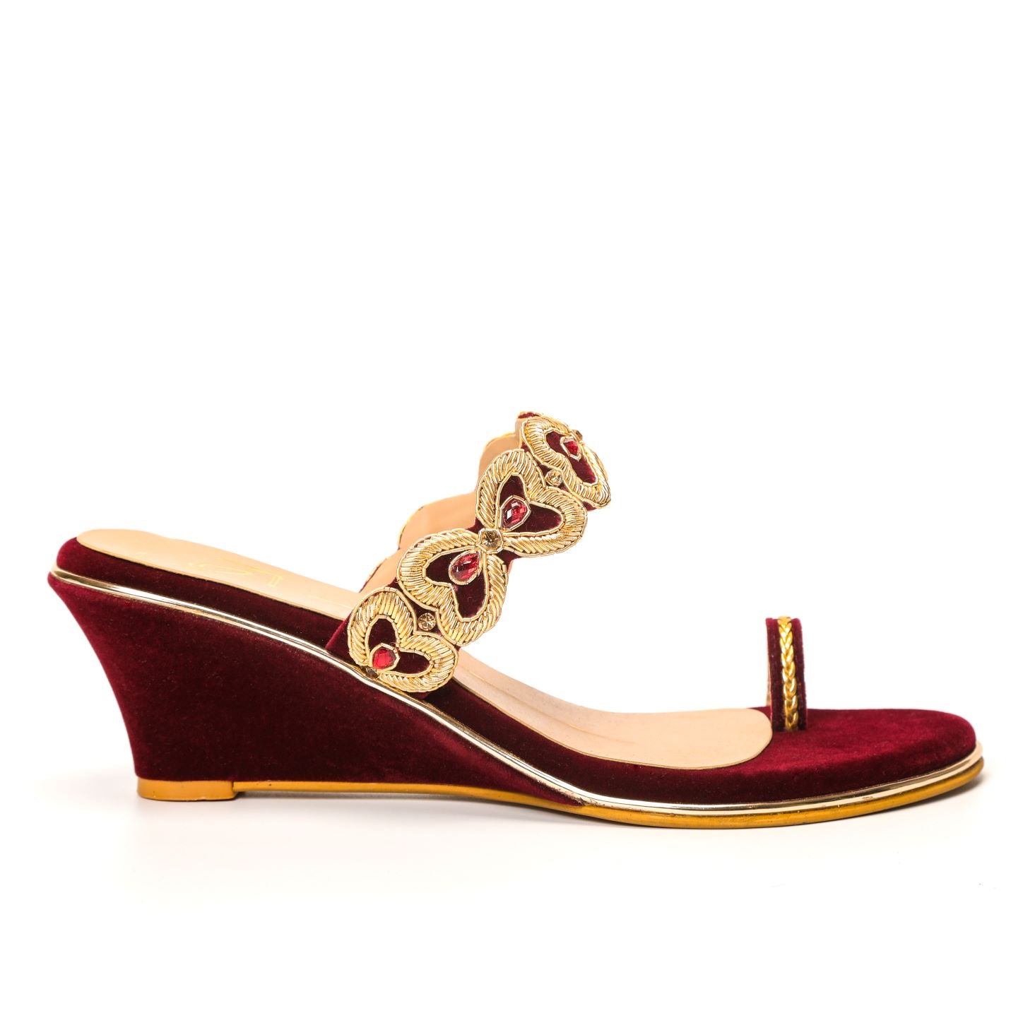 Featuring a pair of Maroon wedges in a velvet base with embroidery. It has a faux leather underlining and 2 inches wedge height